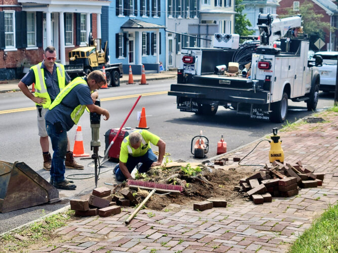 SHEPHERDSTOWN — Workmen remove bricks on a sidewalk along West German Street on Tuesday, so a tree stump can be removed from the sidewalk.