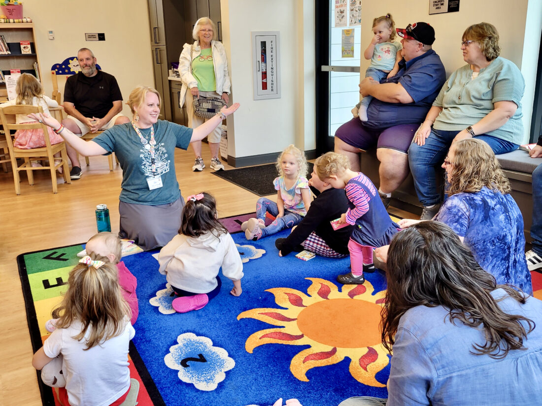 Youth services librarian Jessie Ward leads the Grandparents Day Celebration story time on Saturday morning. Tabitha Johnston