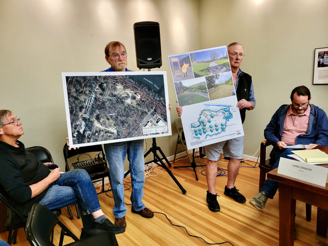 Rotary Club of Shepherdstown members Walt Eifert, left, and Hank Walter hold up some posters, to help the Town Council visualize the club’s plans to build a West Virginia’s Almost Heaven Swing in Shepherdstown. Tabitha Johnston