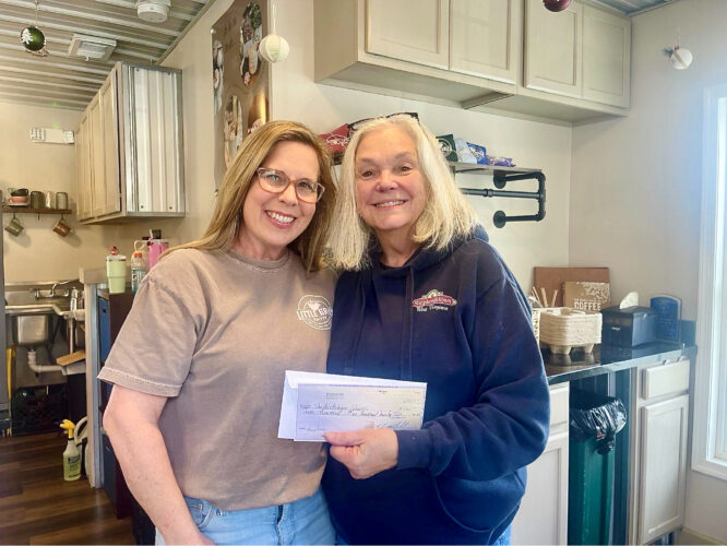 Little Brick Coffee owner Dorrie Pilot, left, gives a check to Shepherdstown Shares board member Jan Hafer in the coffee shop on Dec. 31. Courtesy photo