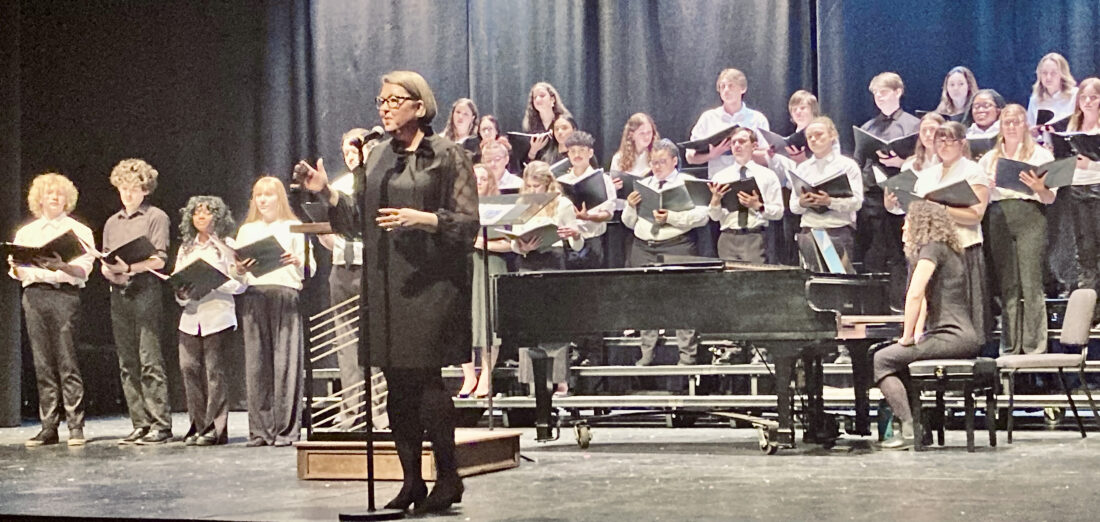 - Eastern Kentucky University assistant professor of vocal music education Jill Campbell introduces a piece being performed by the Honor Choir in the Frank Arts Center Theater on Saturday night. Courtesy photo