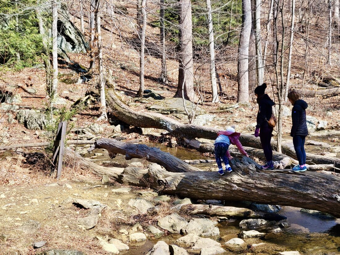 A family walks along a log in Cunningham Falls State Park on Saturday. Tabitha Johnston