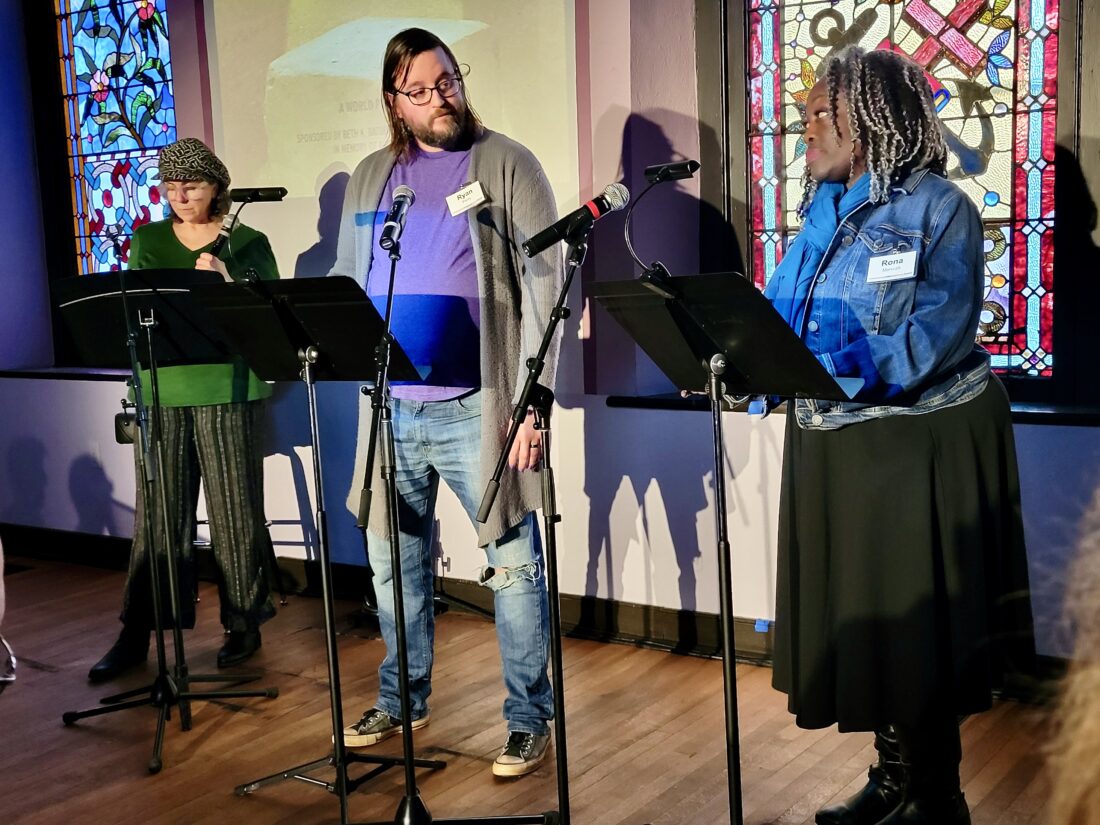 - CATF board member Lisa Younis reads a portion of “Did My Grandfather Kill My Grandfather?” in The Church on March 26. Tabitha Johnston