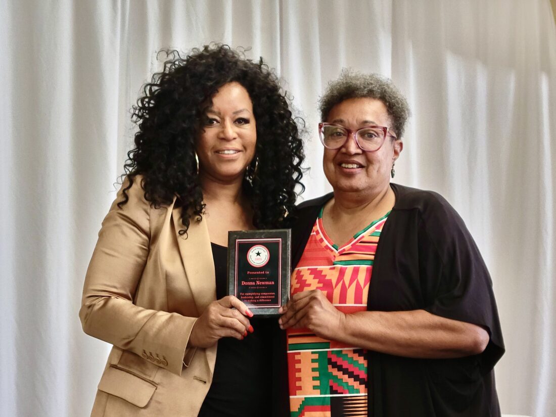 - Black Policy Day Eastern Panhandle organizer Teresa Holmes, right, presents a Heart of the Community Award to Department of Veterans Affairs Health Systems Specialist Donna Newman at Corner Connections on Aug. 15. Photo by Tabitha Johnston