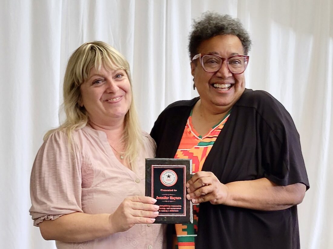 - Shepherdstown resident Jenny Haynes, left, accepts a Heart of the Community Award from Black Policy Day Eastern Panhandle organizer Teresa Holmes in Corner Connections on Aug. 15. Photo by Tabitha Johnston