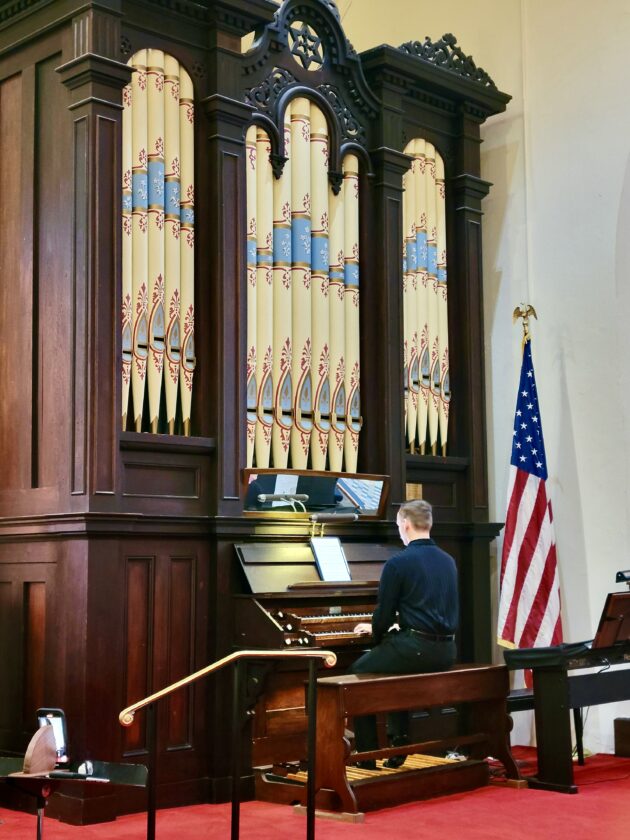 He then kicked off his first Community Organ Recital at the church, with Johann GottFried Walther’s Concerto del Signor Telemann, appropriato all’Organo. That fast-paced piece was followed by two choral preludes by Johann Sebastian Bach, Dietrich Buxtehude’s Toccata in F Major, Florence Price’s “Little Melody” and “Festal March,” two selections from Victor Togni’s Five Liturgical Inventions for Organ, Philip Glass’s “Mad Rush” and the Allegro Maestros with “Come Thou Fount of Every Blessing” by Jeff Perks and George Friedrich Handel.