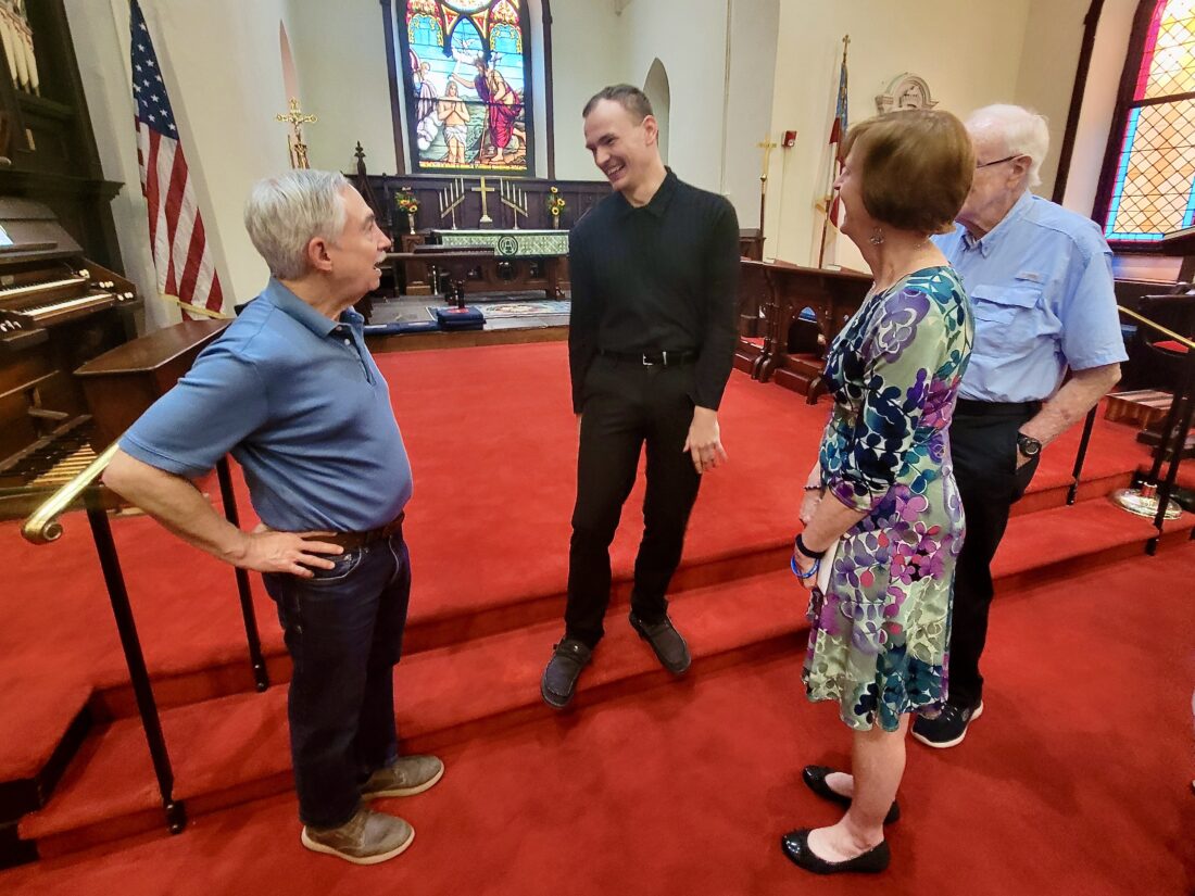 - Organist James Newsome chats with recital attendees in Trinity Episcopal Church on Sunday. Photo by Tabitha Johnston