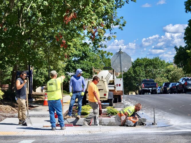 Workmen drill a hole into the pavement beside a new flower bed, which was designed and planted by community volunteers over the summer, at the King Street entrance to Shepherd University’s campus. Photo by Tabitha Johnston