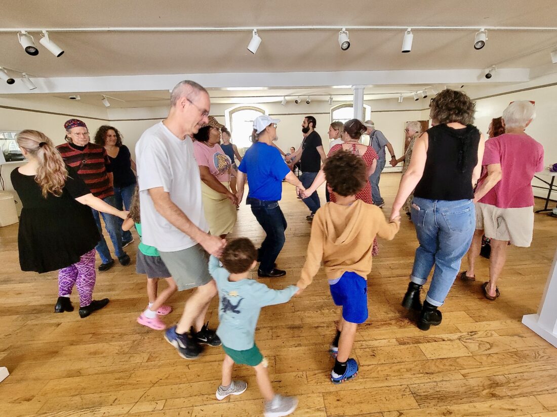 People of all ages dance together in an outer and inner ring, in the War Memorial Building on Saturday. Photo by Tabitha Johnston