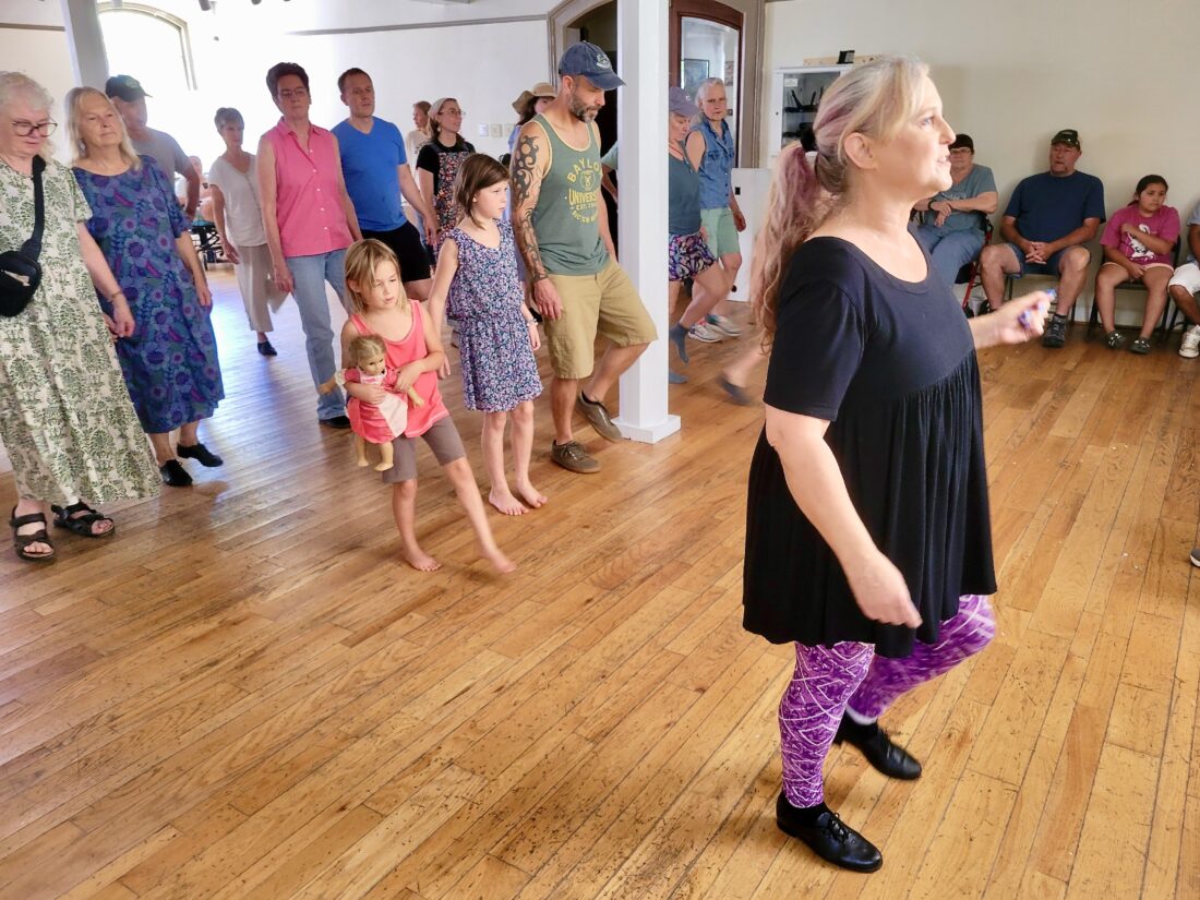 - Emily Crews demonstrates a clogging step to attendees of the “Flatfooting and Appalachian Percussive Dance with Soles in Motion” workshop in the War Memorial Building on Saturday. Photo by Tabitha Johnston