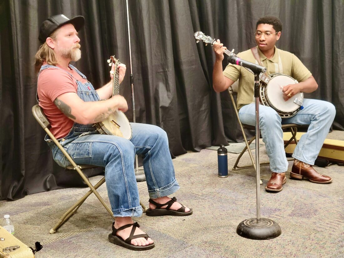 - Ben Townsend, left, and Joshua Jimmerson perform a tune together on their banjos, in Reynolds Hall on Saturday. Photo by Tabitha Johnston