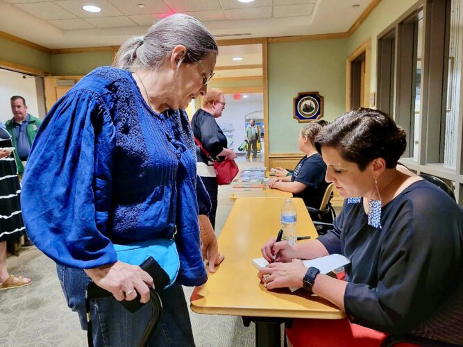 Scrabble resident Katherine Hutson, left, asks Appalachian Writer-in-Residence Annette Saunooke Clapsaddle to sign a copy of her debut novel for Hutson’s aunt, in the Robert C. Byrd Center for Congressional History & Education on Sept. 25. Photo by Tabitha Johnston