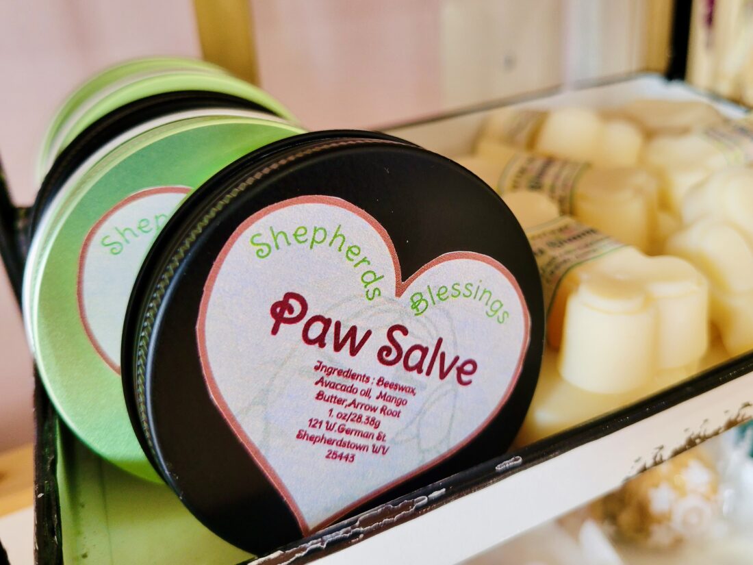 Containers of organic paw salve and dog-safe soap sit on a shelf in Shepherds Blessings. Photo by Tabitha Johnston