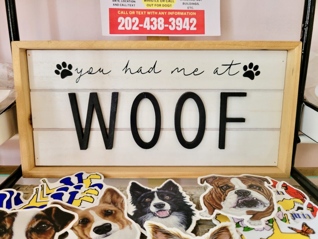 Stickers, with images of dogs on them, lay out in a display at Shepherds Blessings. Photo by Tabitha Johnston