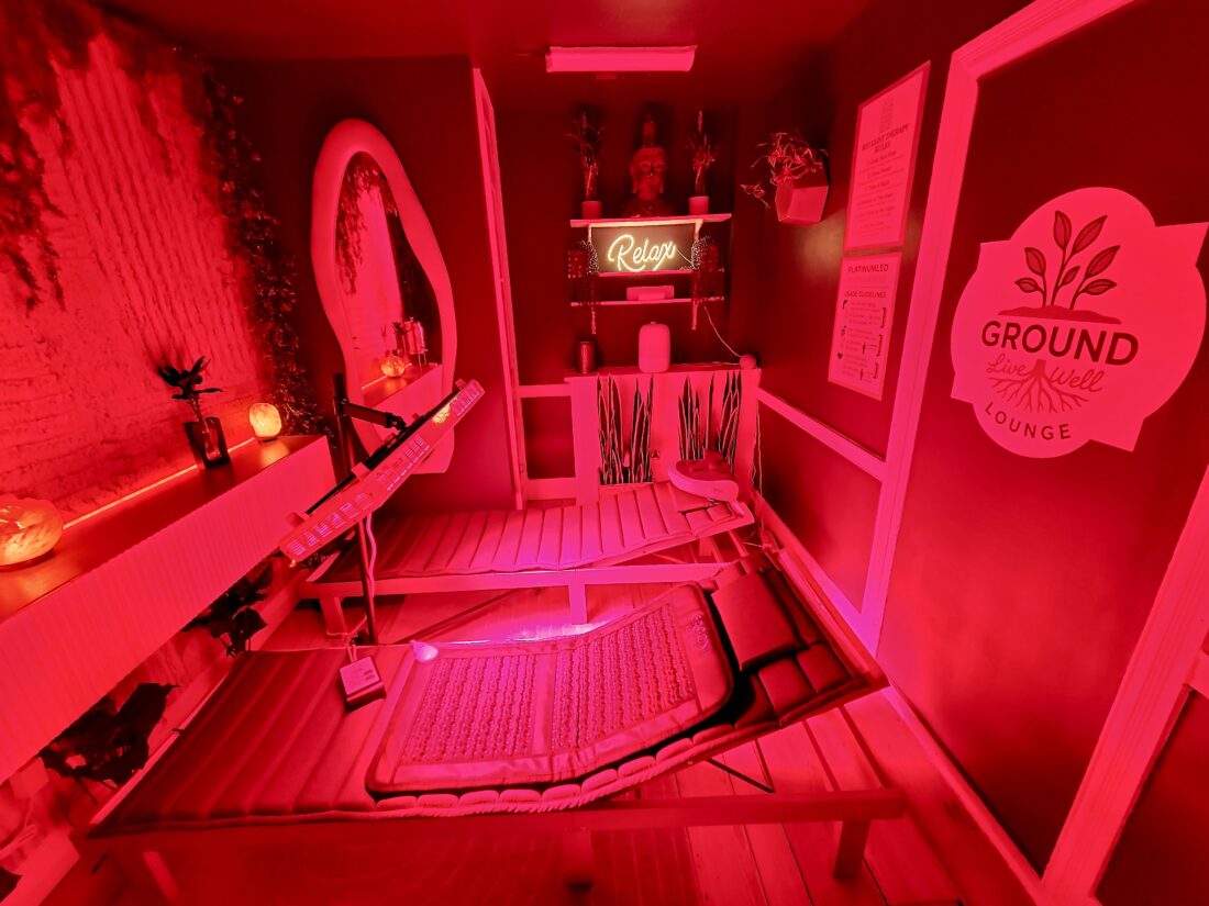 The Ground Lounge’s red light therapy room features two beds and a lymph node massage chair. Photo by Tabitha Johnston