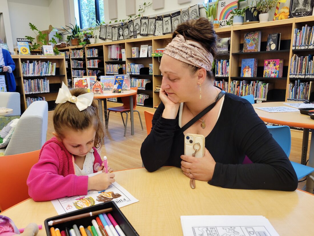 Kindergartener Siena Sarnowski fills out a Fire Safety Plan coloring sheet with the help of her mother, Charles Town resident Crista Sarnowski, in the Shepherdstown Public Library on Oct. 13. Photo by Tabitha Johnston