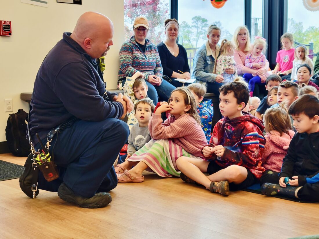 Shepherdstown Volunteer Fire Department Lt. John Sines answers a question from a child at the Shepherdstown Public Library on Oct. 13. Photo by Tabitha Johnston