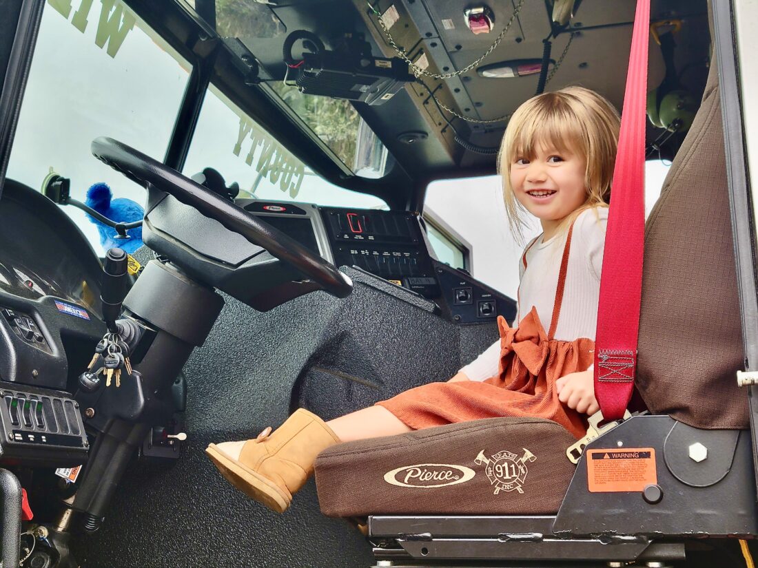 - Three-year-old Emelia Unger sits in the front seat of a fire engine for the first time, by the Shepherdstown Public Library on Oct. 13. Photo by Tabitha Johnston