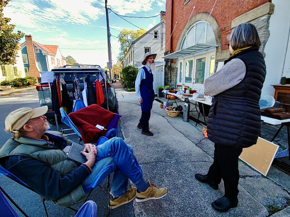 Shepherdstown residents Andy Singletary, left, and Pia Peltola, right, chat about the items in their yard sale with Tim Jacot on Saturday afternoon. Photo by Tabitha Johnston