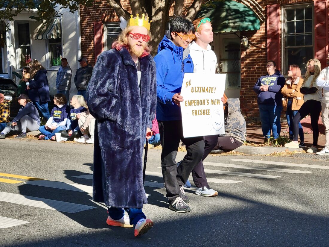 - The Shepherd University Ultimate Frisbee Team, referencing the tale of “The Emperor’s New Clothes,” walks down German Street during the Shepherd University Homecoming Parade on Saturday. Photo by Tabitha Johnston