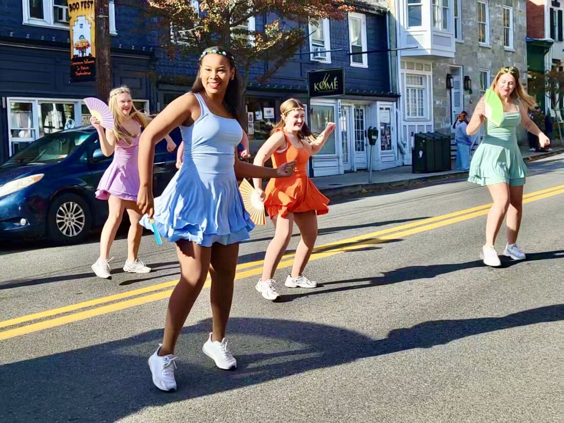 The Shepherd University Dance Team, portraying the tale of the “12 Dancing Princess,” twirls down German Street together during the Shepherd University Homecoming Parade on Saturday. Photo by Tabitha Johnston