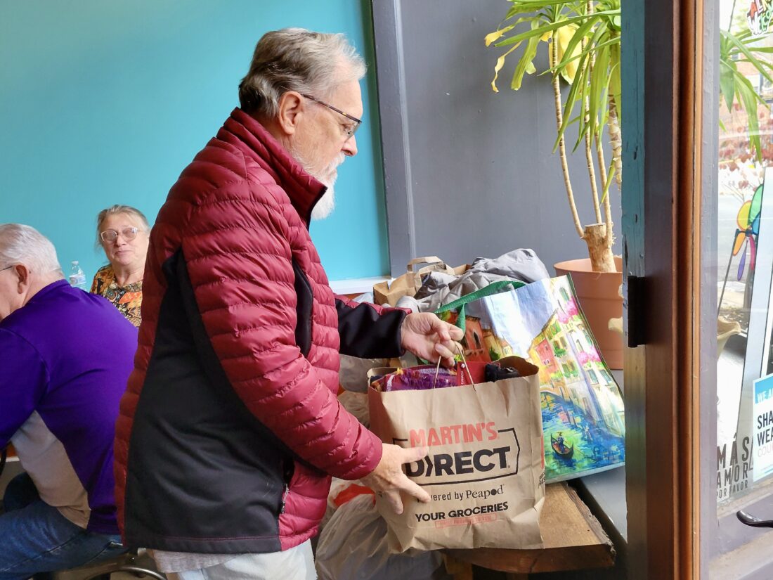 - Gerry Fitzgerald, of Shepherdstown, places a bag filled with new winter clothing in the donation area at Maria’s Taqueria on Nov. 12. Photo by Tabitha Johnston