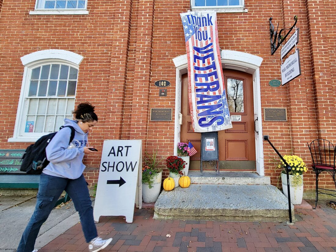A community member steps past the entrance to the Veterans Day Art Show at the War Memorial Building on Veterans Day. Photo by Tabitha Johnston