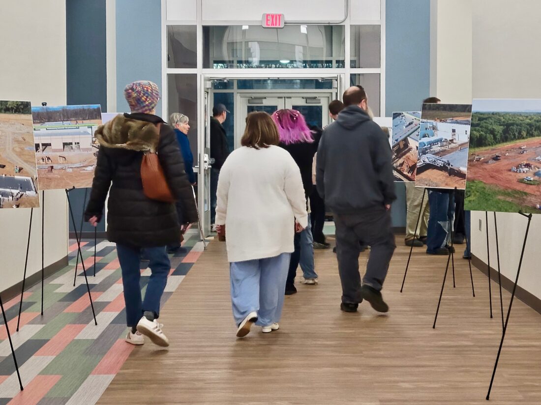 Community members walk through the new Shepherdstown Elementary School building and take in some of the signs that reflect the progress of the project, on Dec. 9. Photo by Tabitha Johnston