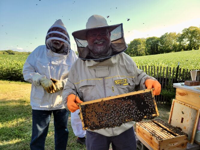 EPBA members Linda Layne and Gary Donely, who own the farm, offered extra beekeeping suits to ...