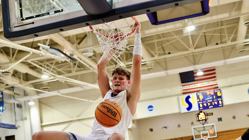 Shepherd University graduate student forward Chase Paar dunks the ball, during Saturday’s game against East Stroudsburg University in the Butcher Center. Courtesy photo